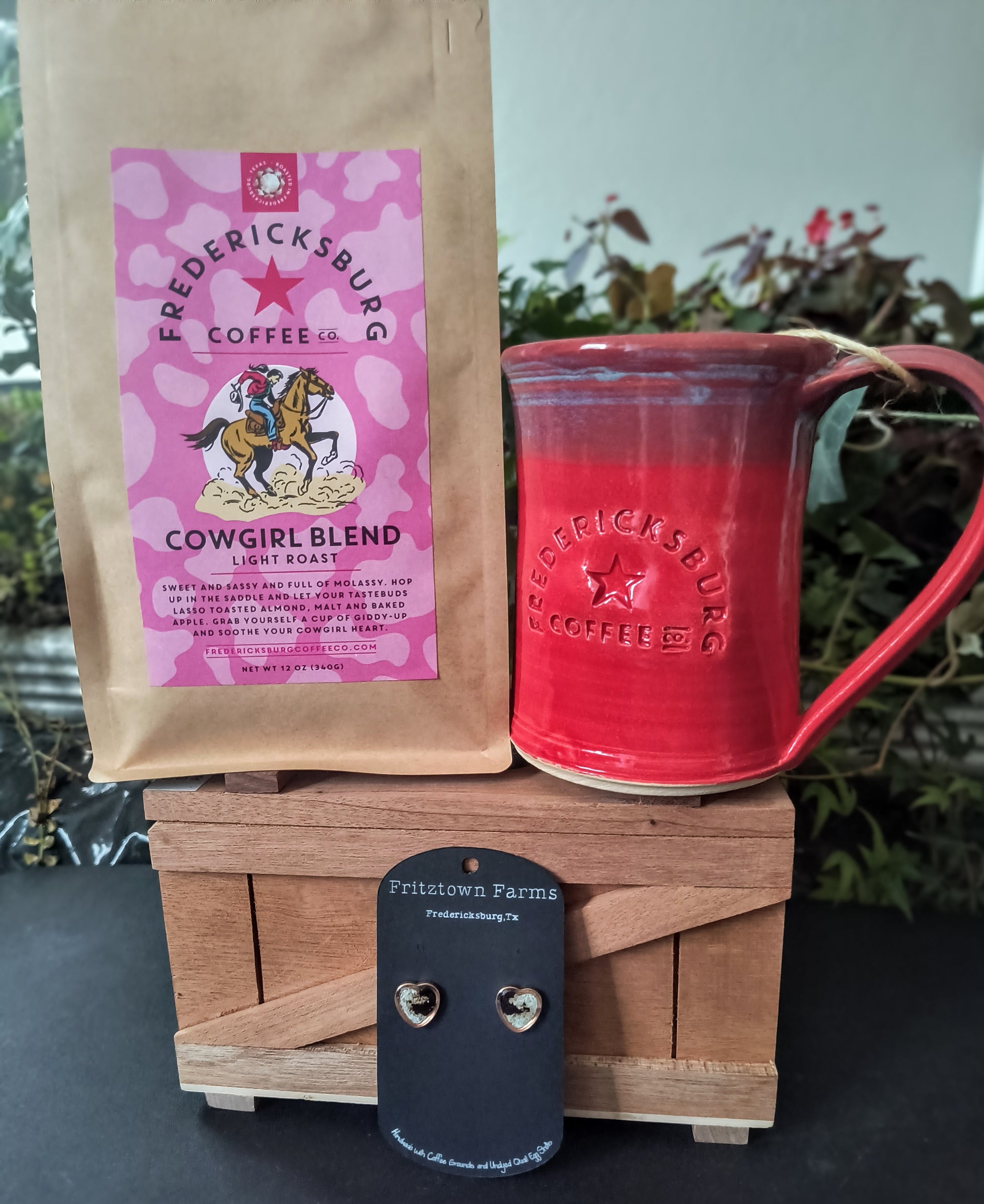For the Cowgirl in your life. This bundle comes with our bestselling, light roasted Cowgirl Blend a beautiful, hand thrown mug and our one of a kind quail eggshell and coffee earrings (made with Fredericksburg Coffee Co coffee).