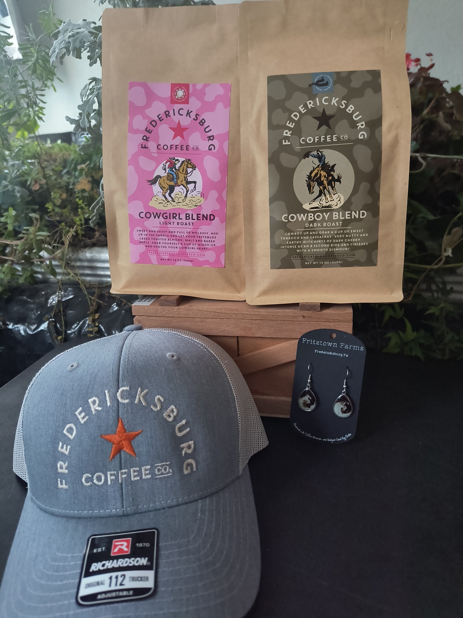 For the Cowboy and Cowgirl in your life. This bundle comes with our bestselling, dark roasted Cowboy Blend and light roasted Cowgirl Blend a beautiful, our embroidered, branded hat and one of a kind, handmade quail eggshell jewelry made with Fredericksburg Co coffee.