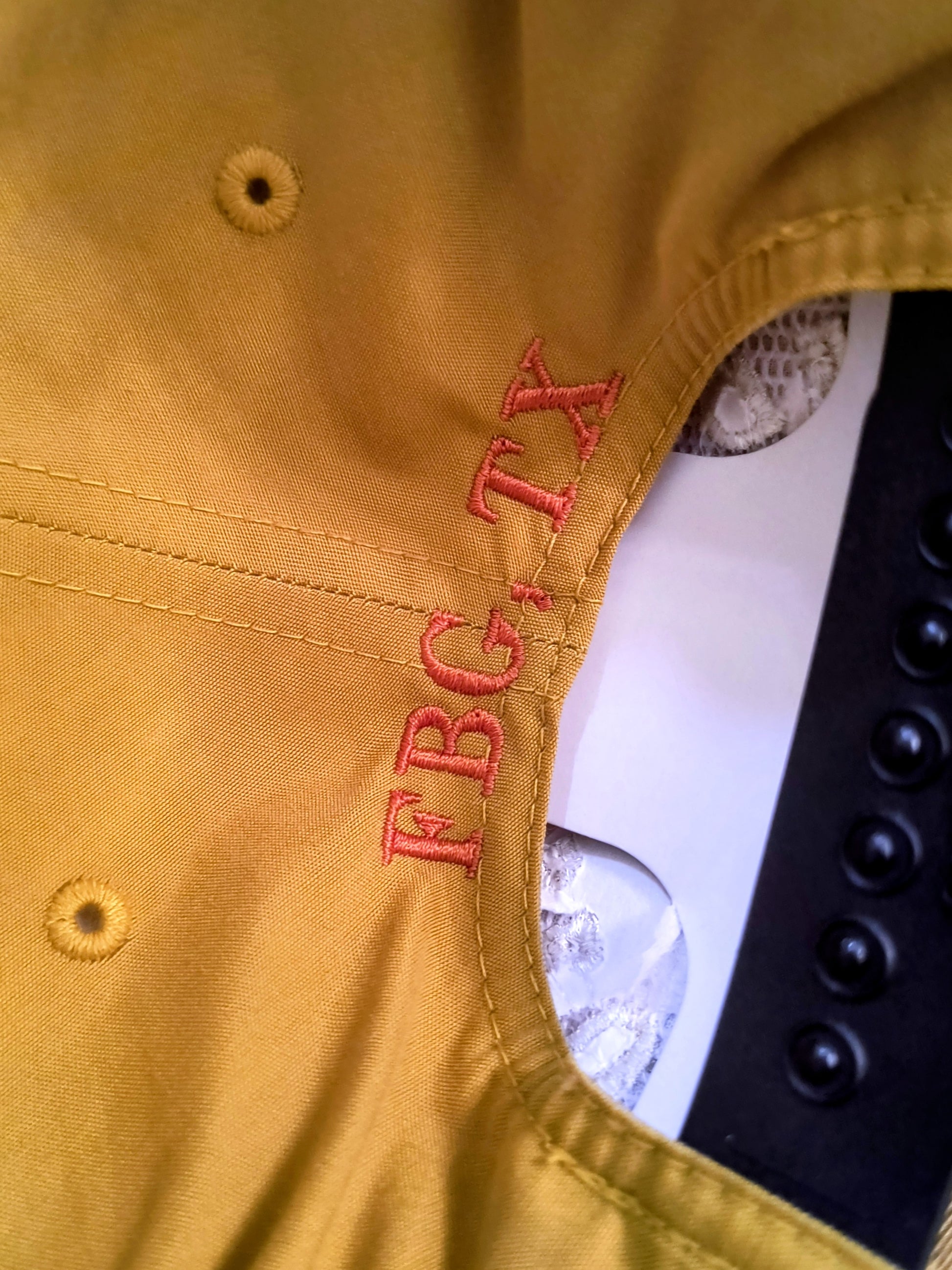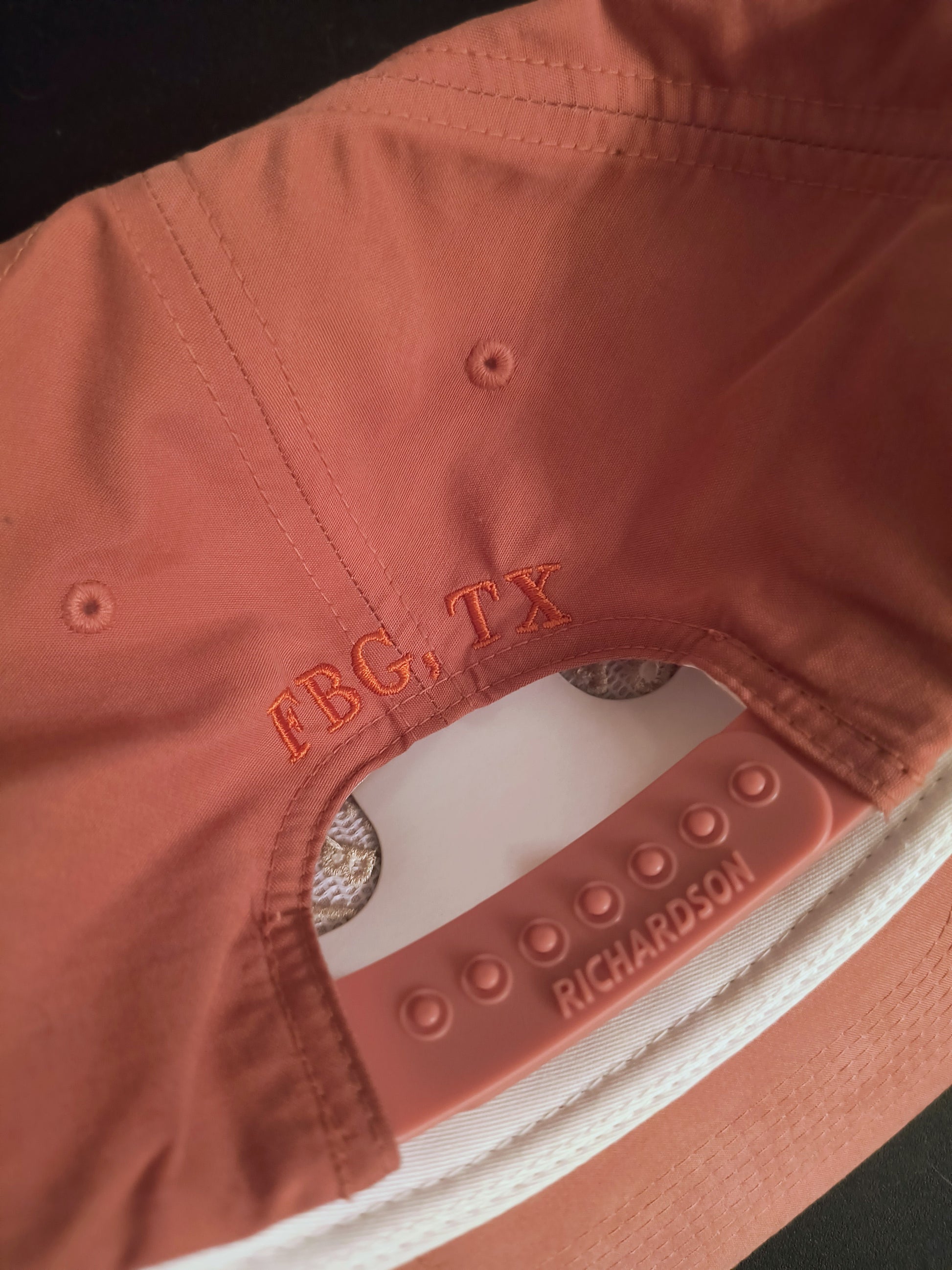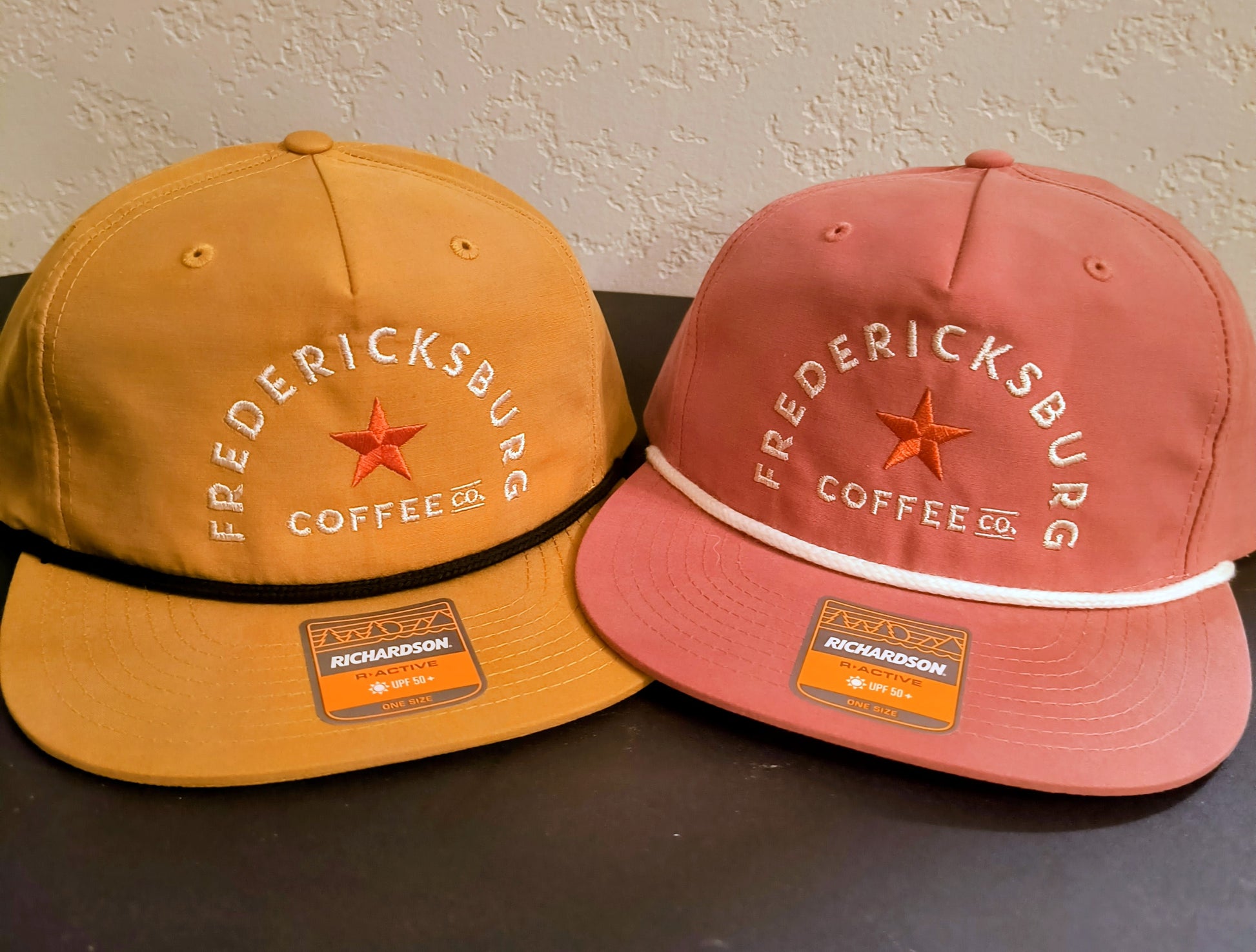 Snapback Cap. Embroidered Fredericksburg Coffee Co logo on front and FBG, TX on back.